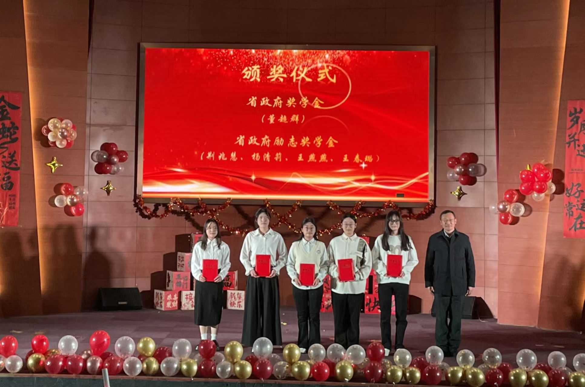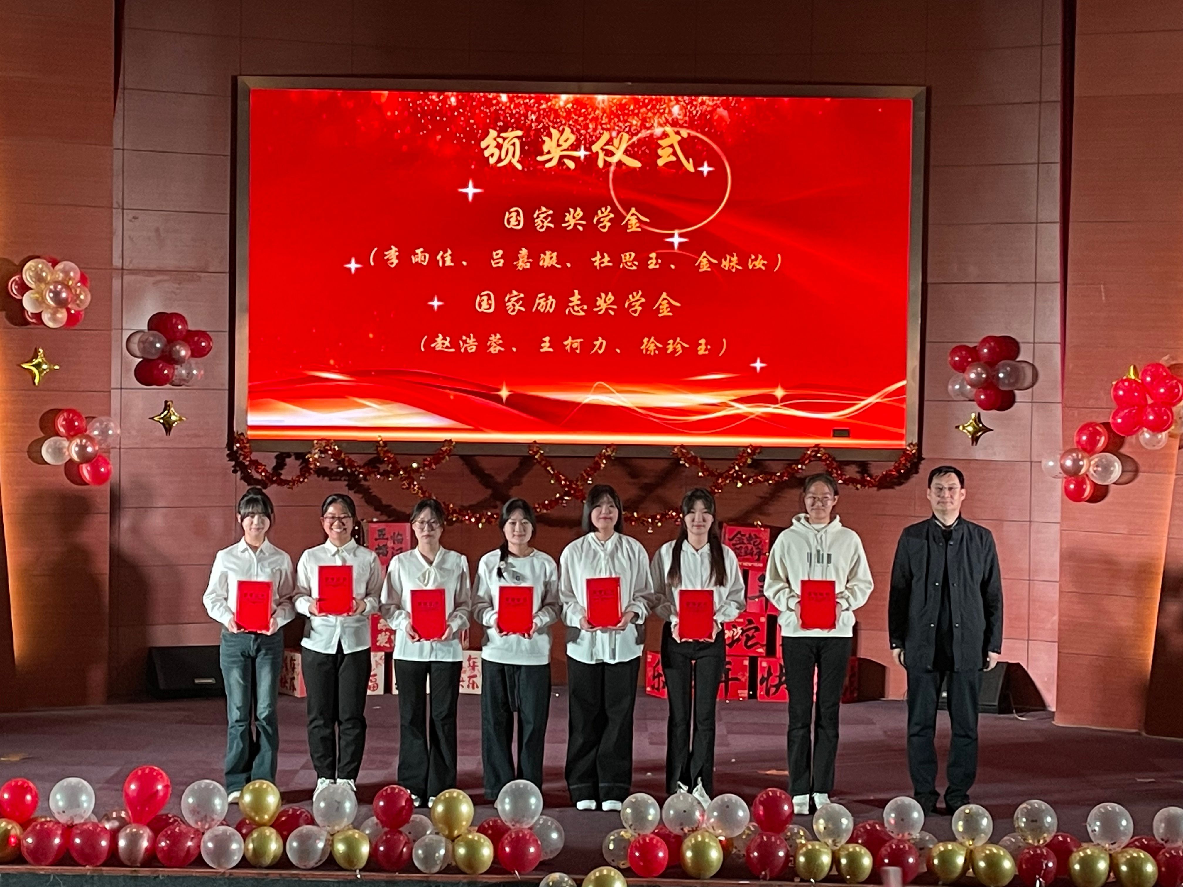 为表彰先进,树立典型,晚会中,学院对荣获2023-2024学年国家奖学金、国家励志奖学金、省政府奖学金、省政府励志奖学金的学生、学科竞赛优秀先进个人、优秀学风宿舍进行了颁奖。迎新年晚会暨表彰大会在《一起向未来》的欢快旋律中落下帷幕。