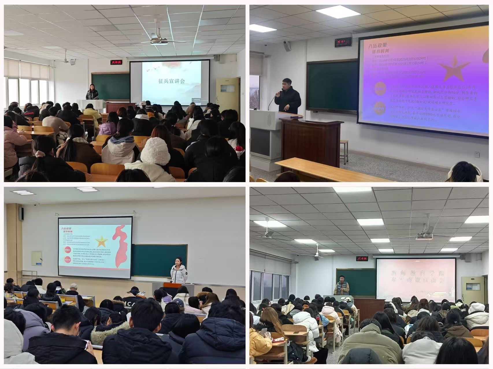 为全面贯彻落实新时代党的强军思想,积极动员大学生应征入伍,切实推动我校大学生征兵工作,2024年12月25-26日,教师教育学院面向各年级同学分批次开展了征兵宣讲会。