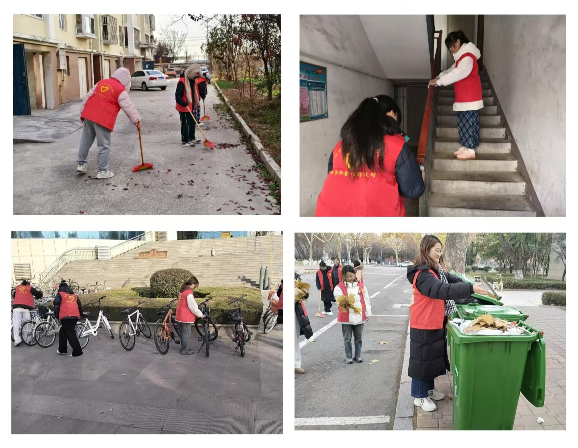志愿者们走进教师教育学院和富邦新都小区进行清洁志愿活动。社区清洁志愿者们帮助居民们打扫地上的落叶,擦拭楼道内的扶手;教师教育学院清洁志愿者们打扫落叶,摆正停放的自行车和倒垃圾。无论是社区还是校园,志愿者们都以实际行动诠释着奉献的美好。