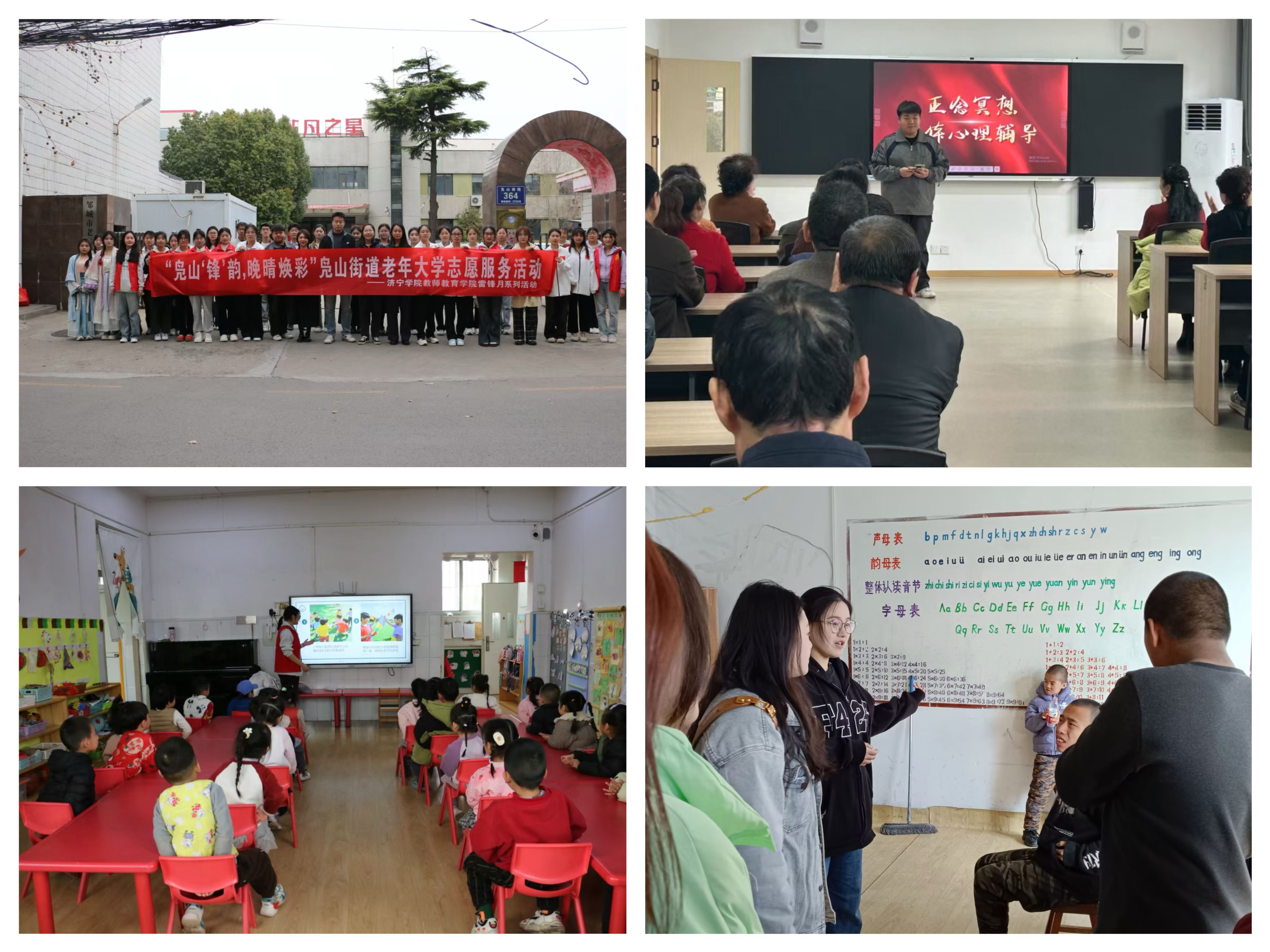 “锋”采有我,践行精神。学院将雷锋精神和实践育人有机结合,组织学生党员、团员青年、受资助学生走进邹城市凫山街道老年大学、幼儿园,曲阜市杏坛小学、圣德书院开展了“青春暖夕阳 童心映雷锋”主题志愿服务活动。活动期间,志愿者结合专业特色,以团体心理辅导慰藉长者心灵、用趣味课堂点燃幼儿求知热情、以爱心陪伴交流温暖特殊儿童。