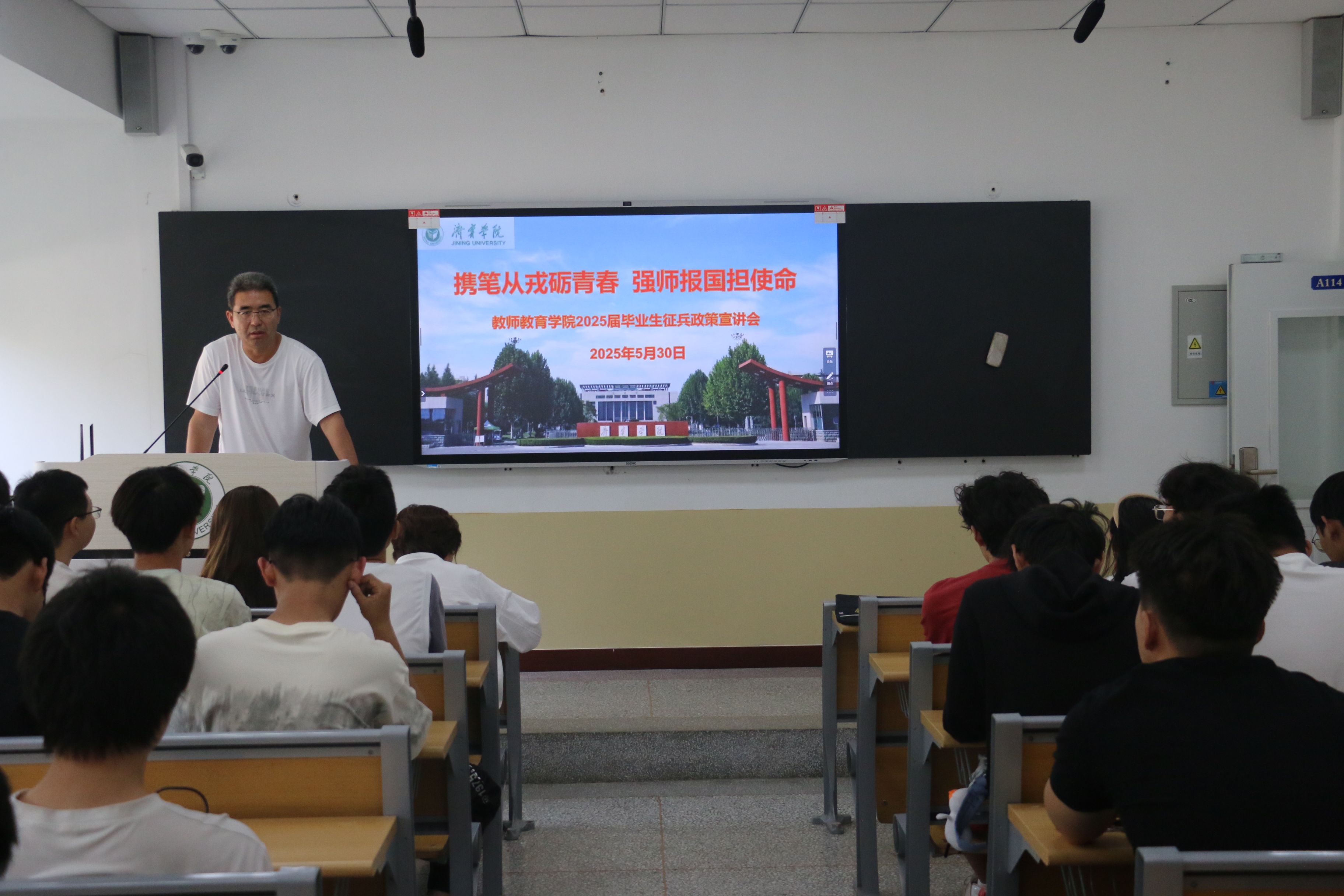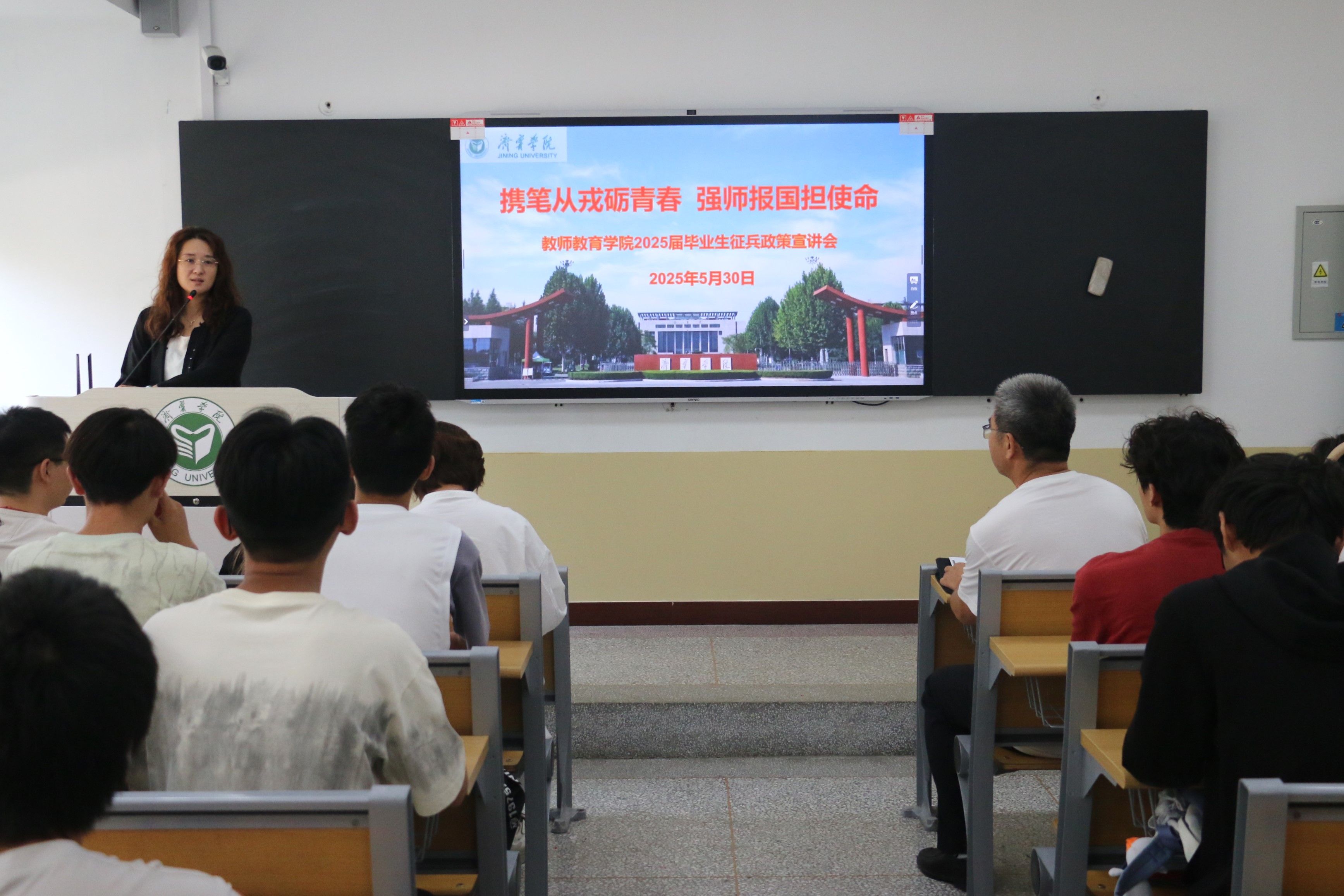 为鼓励学生响应国家号召参军入伍,5月30日上午,教师教育学院于2号楼A114举行征兵政策宣讲会。学院党委副书记杜鹃、学生工作处(武装部)国防教育科科长胡敏、全体辅导员及2025届、2026届毕业生代表参加。