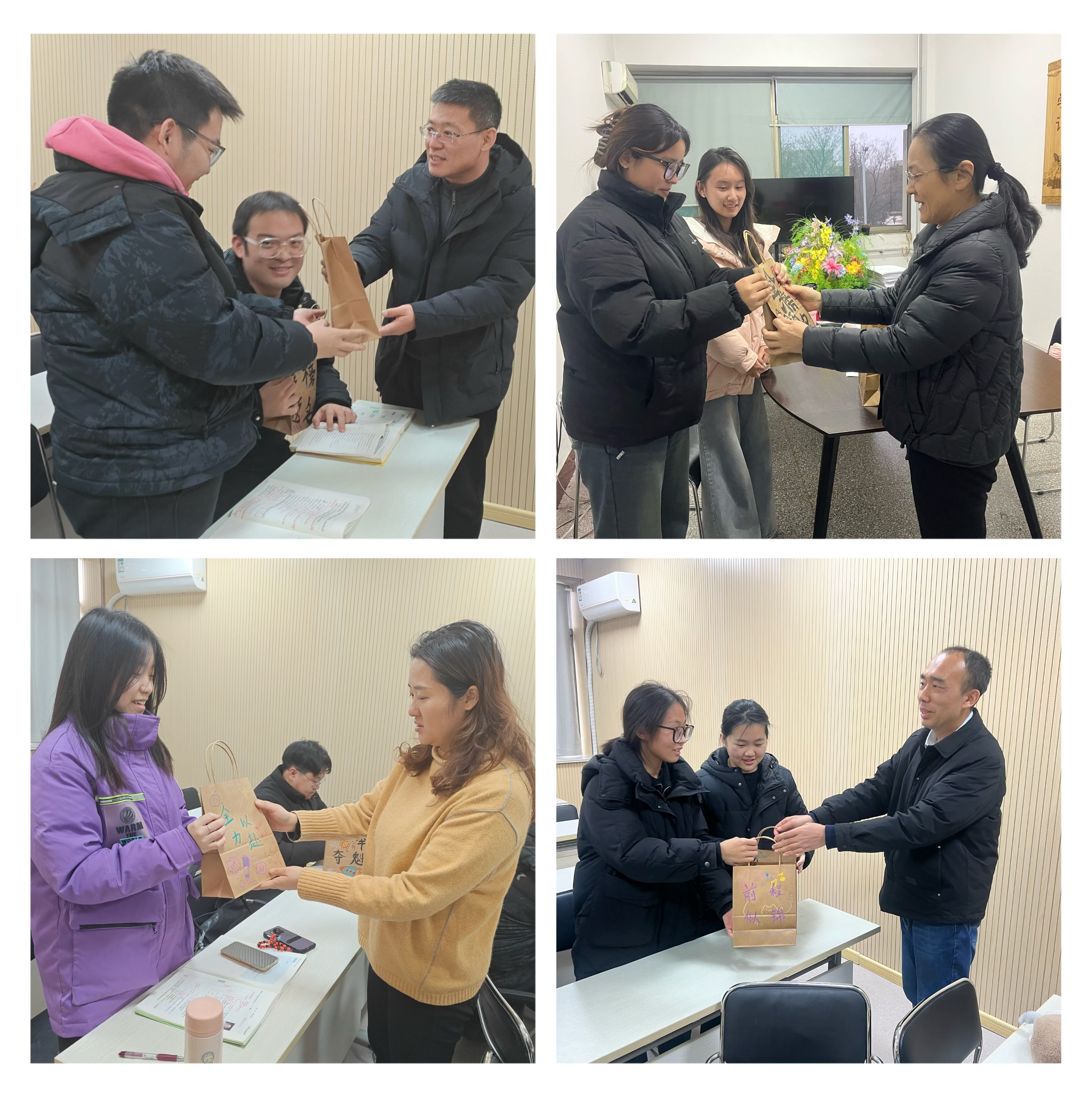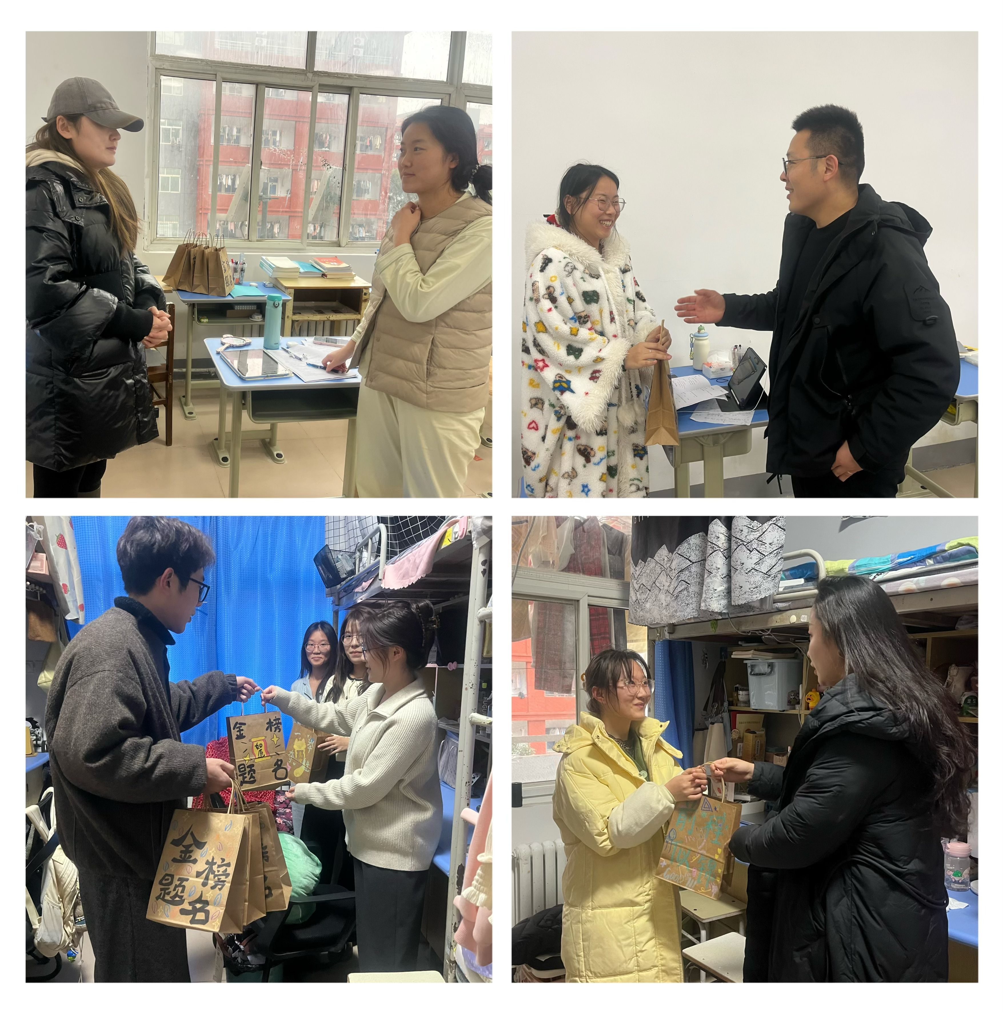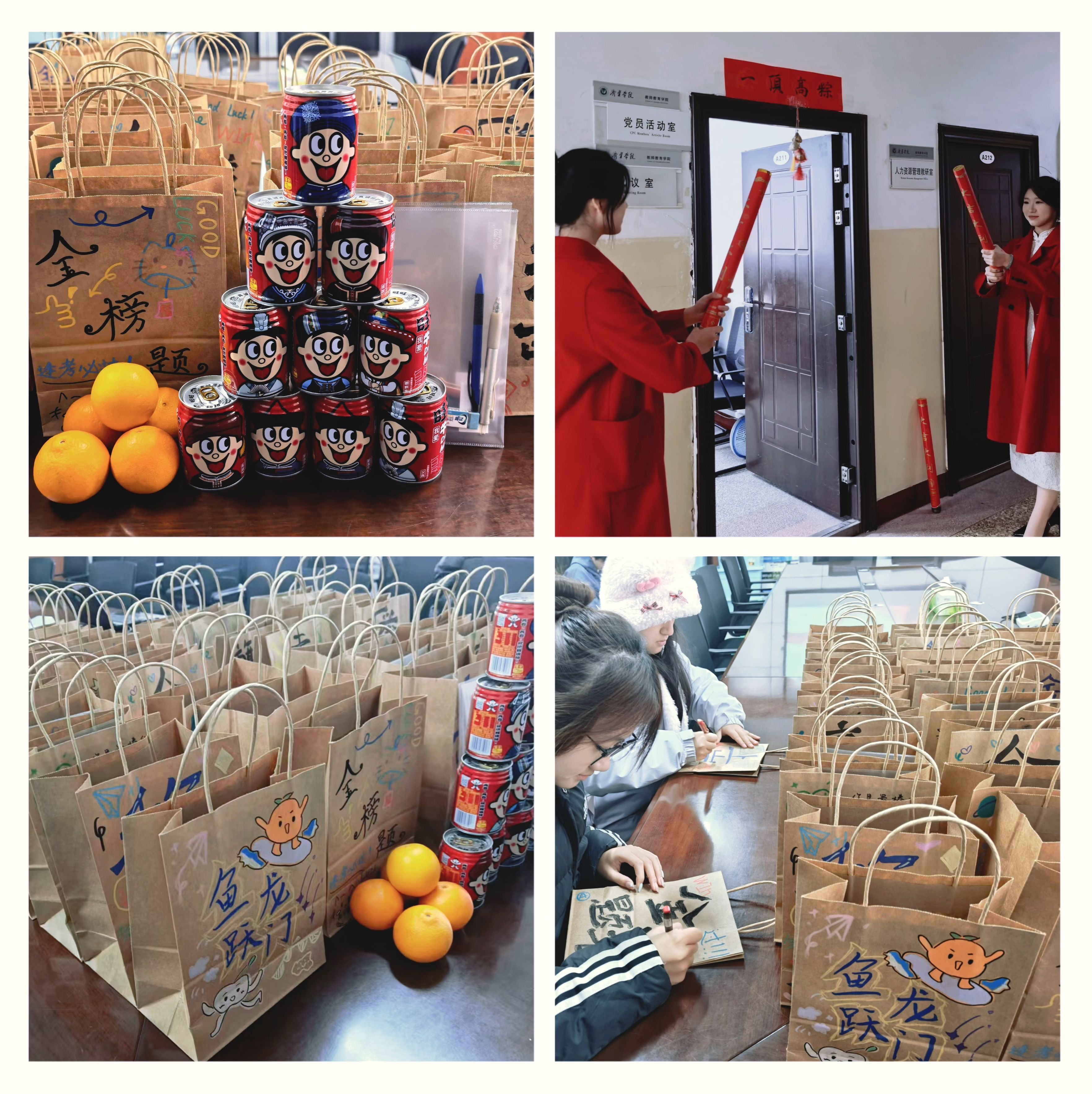随后,学院老师和辅导员为同学们送上了由学弟学妹亲手准备的“考研加油福袋”以及“一顶高粽”特别礼物。福袋内装有考试文具、甜橙、旺仔牛奶,福粽等寓意美好的物品,每一份礼物都承载着全院师生对考研学子深切的祝福与期待。同学们纷纷表示,这份“温暖的惊喜”让备考的疲惫得以缓解,也让前进的脚步更加坚定。
