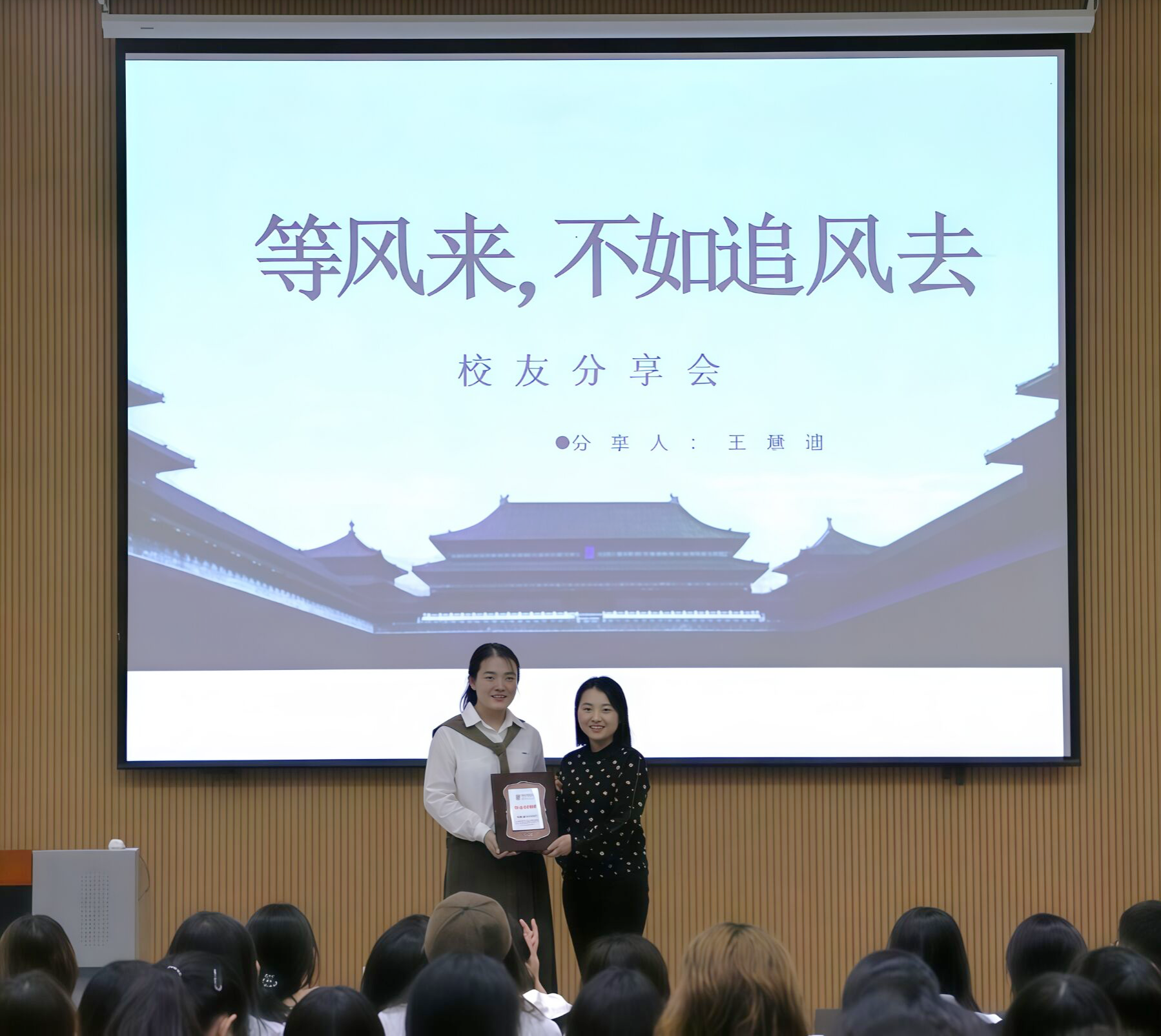 贾英侠为优秀校友王慧迪颁赠了“校友大讲堂”纪念铭牌,并对王慧迪回归母校为同学们作报告分享表示欢迎,勉励同学们向学姐学习,既要目光长远,放眼未来,又要脚踏实地,务实肯干。